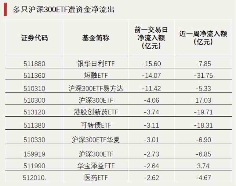 上周五備受資金青睞的部分寬基指數(shù)ETF在3月18日遭遇資金凈流出。在前一交易日的ETF資金凈流出前10榜中,掛鉤滬深300指數(shù)的ETF占4只,合計(jì)凈流出超20億元。部分滬深300ETF在3月17日至18日遭資金連續(xù)流出,合計(jì)凈流出金額遠(yuǎn)超上周五的凈流入金額。