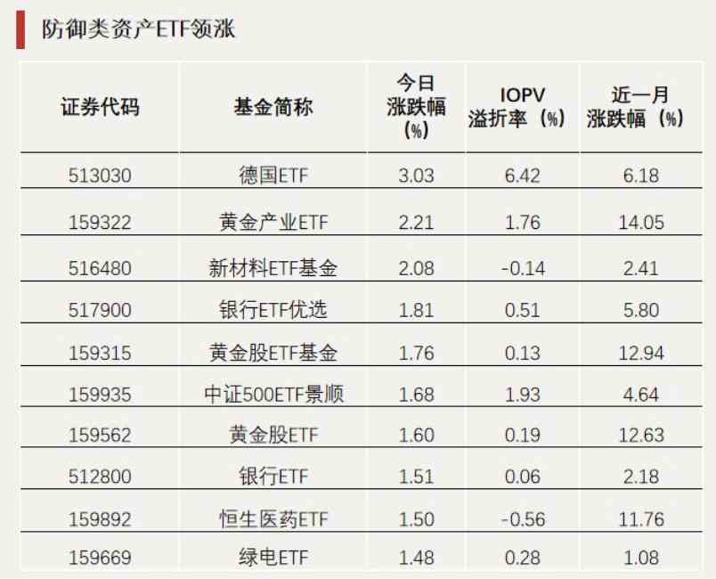 黃金、銀行、綠電等防御類(lèi)板塊ETF領(lǐng)漲,多只黃金股票ETF實(shí)現(xiàn)兩連漲。漲幅居首位的德國(guó)ETF(513030)尾盤(pán)突然大幅放量。此前熱門(mén)的TMT板塊ETF回調(diào)較為明顯,電信、通信、云計(jì)算等板塊的部分ETF跌幅超過(guò)2%。