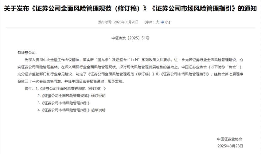 摘要: 3月28日,中國證券業(yè)協(xié)會發(fā)布通知,為深入貫徹中央金融工作會議精神,落實新“國九條”及證監(jiān)會“1+N”系列政策文件要求,進一步完善證券行業(yè)全面風險管理建設,夯實證券公司風險管理基礎,