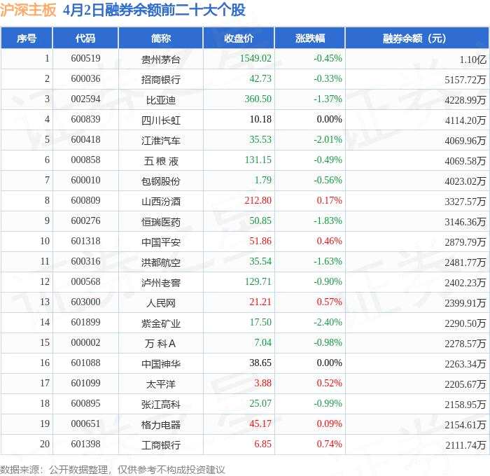 滬深主板融券余額前三分別為:貴州茅臺(600519)融券余額1.1億元、招商銀行(600036)融券余額5157.72萬元、比亞迪(002594)融券余額4228.99萬元,前20具體見下表: