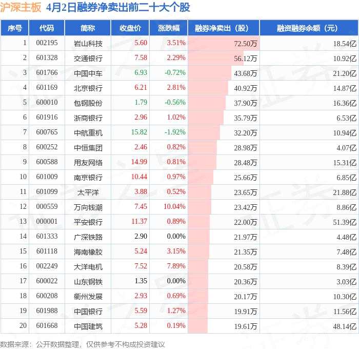 4月2日滬深主板融券凈賣出排行榜:巖山科技融券凈賣出居首