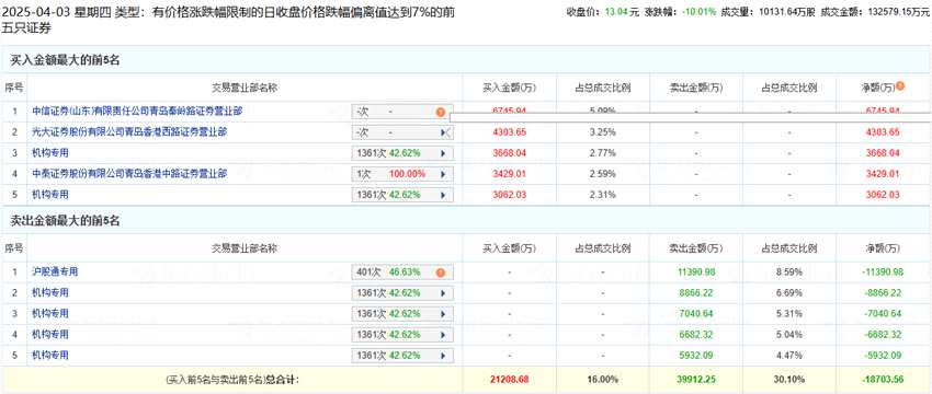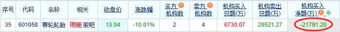 摘要: 互聯(lián)網(wǎng)北京4月3日訊賽輪輪胎(601058)(601058.SH)今日跌停,收報13.04元,跌幅10.01%,總市值428.77億元。龍虎榜數(shù)據(jù)顯示,買入賽輪輪胎金額最大的前5名中,