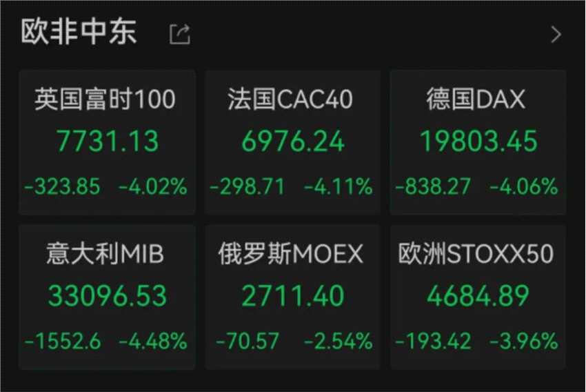 歐美金融市場低位震蕩,跌幅有所收窄。據(jù)數(shù)據(jù),截至北京時間19:30,歐洲斯托克50指數(shù)跌3.96%,德國DAX指數(shù)、英國富時100指數(shù)、意大利MIB指數(shù)、法國CAC40指數(shù)均跌逾4%。
