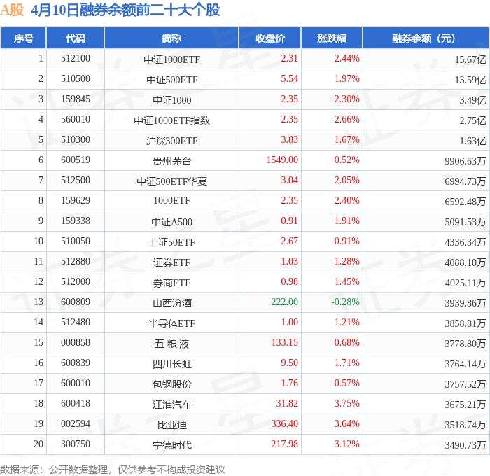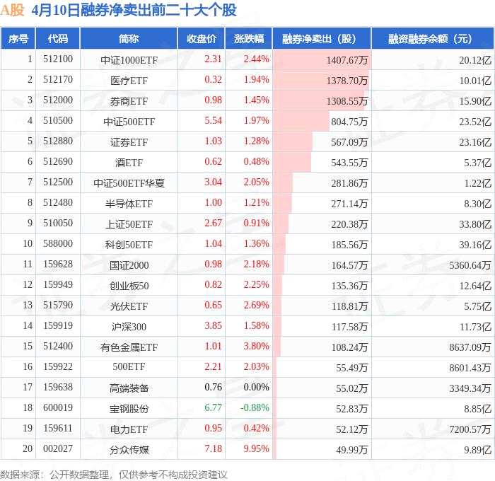 4月10日A股融券凈賣出排行榜:中證1000ETF融券凈賣出居首