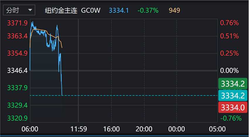 COMEX黃金自3370美元/盎司高點短線跳水超30美元,最新報3335.5美元/盎司。