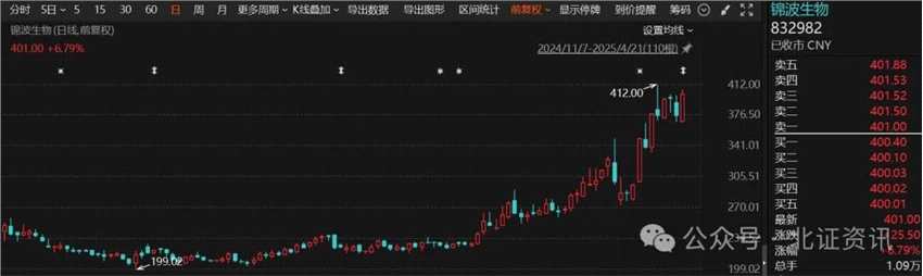 二級(jí)市場(chǎng)上,錦波生物近期股價(jià)走出明顯的上升行情,股價(jià)一度觸及412元?jiǎng)?chuàng)出歷史新高,以今日最新收盤價(jià)401元計(jì)算,該股總市值為355億元,位居北交所股票市值第一。