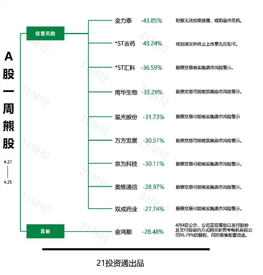 本期十大熊股中,金力泰(300225)(300225.SZ)以43.85%的跌幅成為本期的最熊股。*ST吉藥(300108)(300108.SZ)、*ST匯科(300561)(300561.SZ)、南華生物(000504)(000504.SZ)、星光股份(002076)(002076.SZ)、萬(wàn)方發(fā)展(000638)(000638.SZ)等股的周跌幅均在27%以上。
