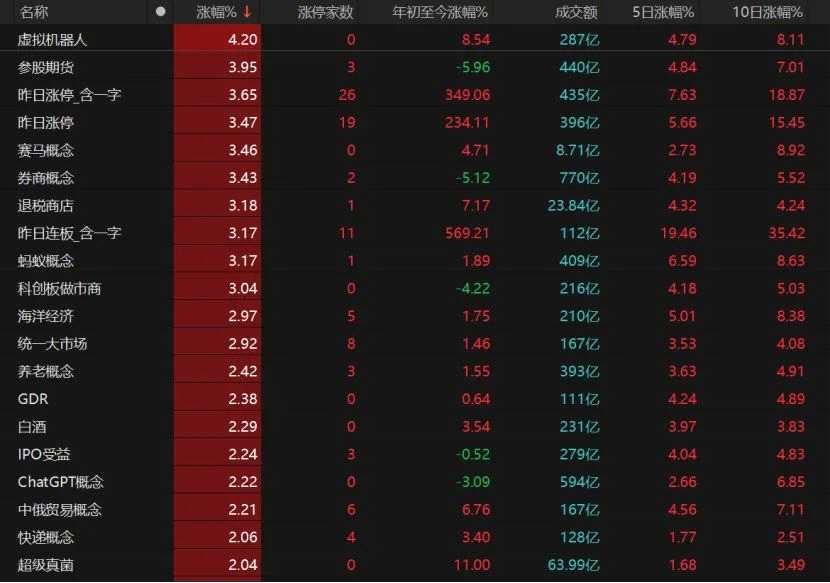 虛擬機器人概念大漲4.2%,參股期貨、券商概念、科創(chuàng)板做市商漲幅均超過3%,白酒、中俄貿(mào)易概念等均表現(xiàn)不錯。