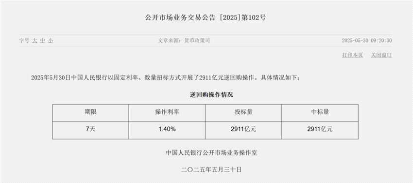 首先來看央行動作:5月30日,央行公開市場開展2911億元7天期逆回購操作,操作利率為1.40%。數(shù)據(jù)顯示,今日共有1425億元逆回購到期。