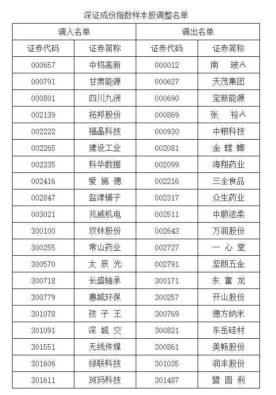 其中,深證成指調(diào)入中鎢高新(000657)、甘肅能源(000791)、四川九洲(000801)等20只股票,調(diào)出南玻A(000012)、天茂集團(000627)、寶新能源(000690)等20只股票。