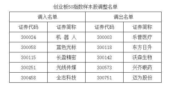 創(chuàng)業(yè)板50調(diào)入機器人、藍色光標、全志科技等5只股票,調(diào)出樂普醫(yī)療(300003)、東方日升、沃森生物(300142)等5只股票。