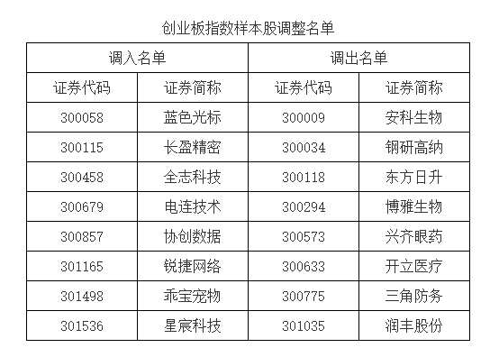 創(chuàng)業(yè)板指調(diào)入藍色光標(300058)、全志科技(300458)、乖寶寵物(301498)等8只股票;調(diào)出安科生物(300009)、鋼研高納(300034)、東方日升(300118)等8只股票。