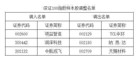 深證100調(diào)入領益智造(002600)、潤澤科技(300442)、中航成飛(302132)3只股票;調(diào)出TCL中環(huán)(002129)、納思達(002180)、天賜材料(002709)3只股票。