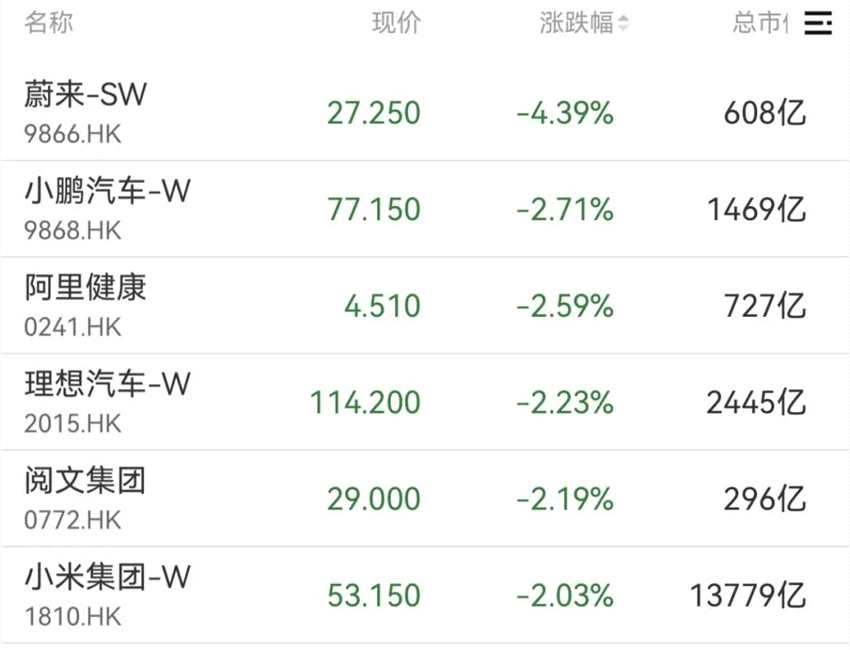 港股三大指數(shù)走低,蔚來跌超4%,小鵬汽車、理想汽車、小米集團均跌超2%。