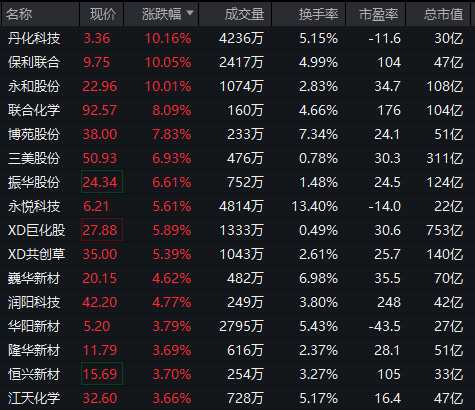 化工板塊逆市拉升,丹化科技(600844)、保利聯(lián)合(002037)、永和股份(605020)漲停,聯(lián)合化學(301209)、博苑股份(301617)、三美股份(603379)等跟漲。
