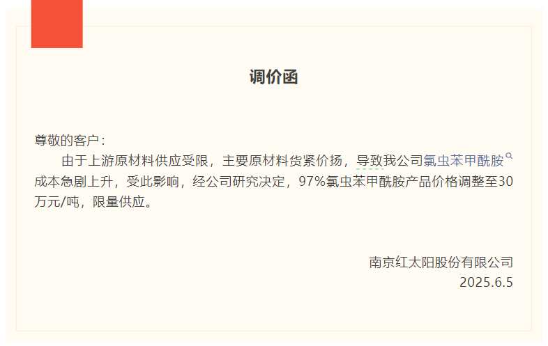 消息面上,6月5日,南京紅太陽股份有限公司發(fā)布的調(diào)價函稱,由于上游原材料供應受限,主要原材料貨緊價揚,公司氯蟲苯甲酰胺成本急劇上升。受此影響,經(jīng)公司研究決定,97%氯蟲苯甲酰胺產(chǎn)品價格調(diào)整至30萬元/噸,限量供應。