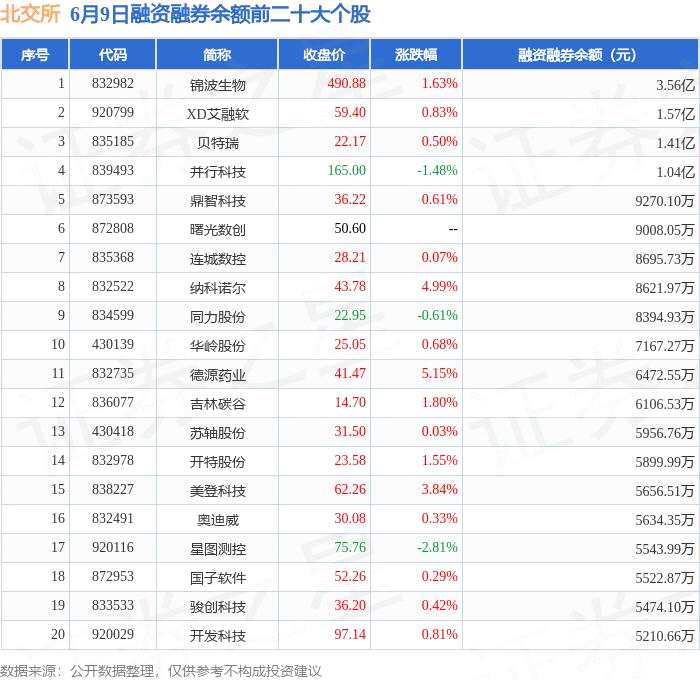 北交所融資融券余額前三分別為:錦波生物(832982)融資融券余額3.56億元、XD艾融軟(920799)融資融券余額1.57億元、貝特瑞(835185)融資融券余額1.41億元,前20具體見下表: