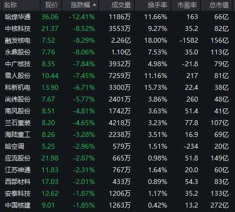 核電股集體走低,哈焊華通(301137)跌超10%,中核科技(000777)、融發(fā)核電(002366)、中廣核技(000881)等多股跌超7%。