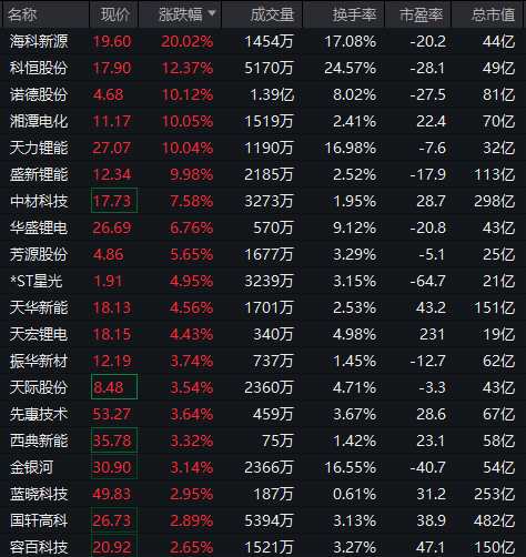 此外,鋰電池概念震蕩走高,??菩略矗?01292)開盤不到7分鐘,直線拉漲停,漲幅達20%;諾德股份(600110)、湘潭電化(002125)、盛新鋰能(002240)等多股漲停。