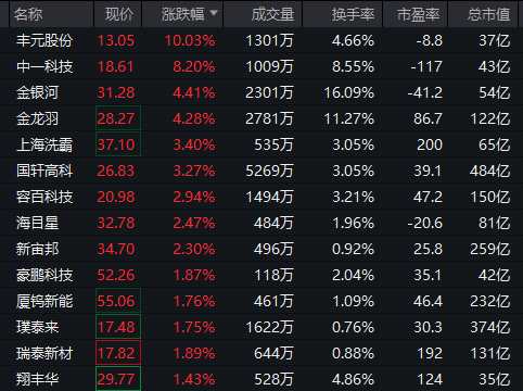 固態(tài)電池概念股表現(xiàn)活躍,豐元股份(002805)漲停,中一科技(301150)、金銀河(300619)、國軒高科(002074)等跟漲。