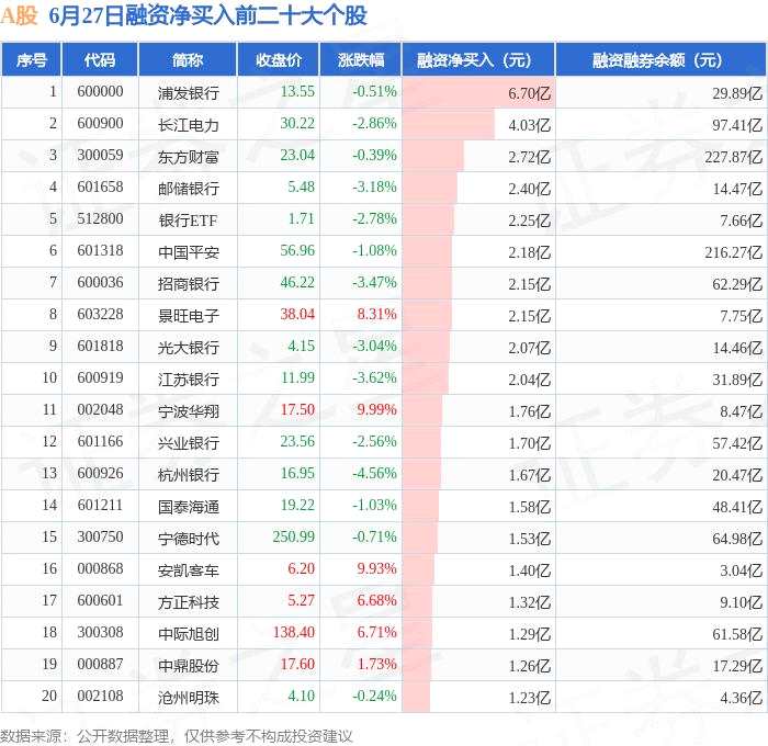 6月27日A股融資凈買入排行榜:浦發(fā)銀行融資凈買入居首