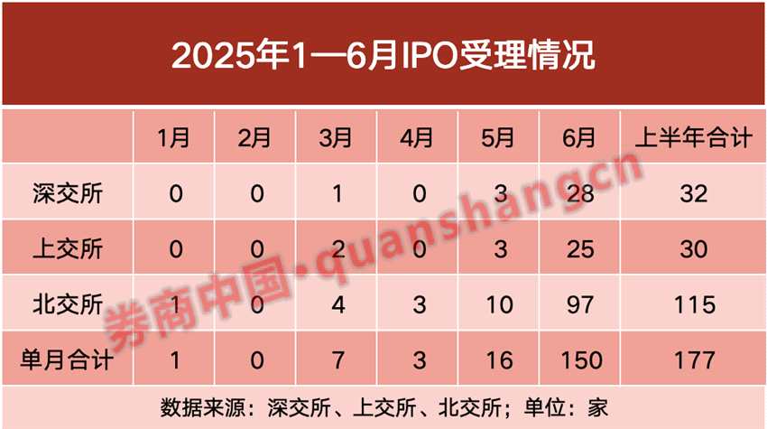 伴隨上半年落下帷幕,6月IPO受理高峰結(jié)束。根據(jù)券商中國記者的統(tǒng)計,今年6月共有150家IPO獲得受理,較去年同期(30家)實現(xiàn)數(shù)倍增長。