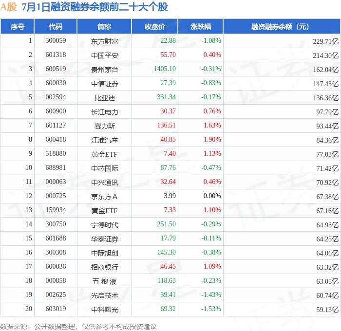 A股融資融券余額前三分別為:東方財富(300059)融資融券余額229.71億元、中國平安(601318)融資融券余額214.3億元、貴州茅臺(600519)融資融券余額162.04億元,前20具體見下表:
