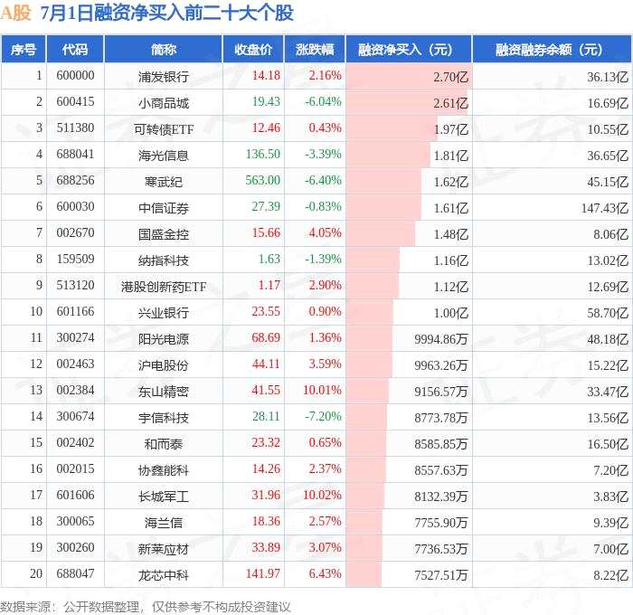7月1日A股融資凈買入排行榜:浦發(fā)銀行融資凈買入居首