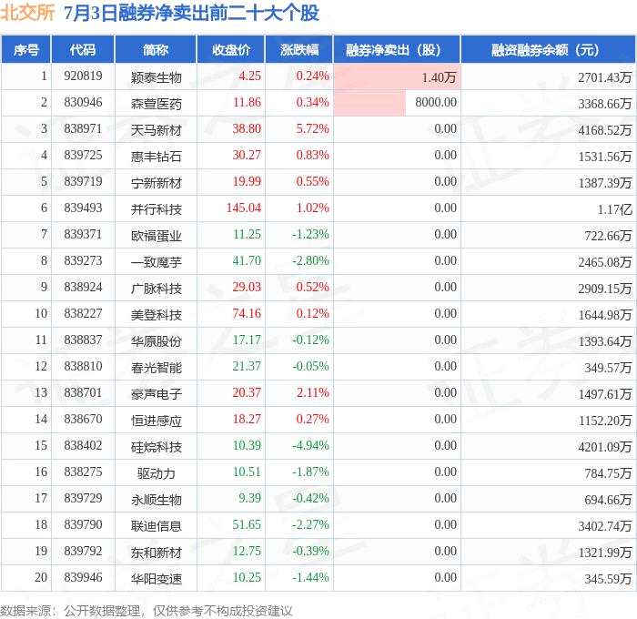 7月3日北交所融券凈賣(mài)出排行榜:穎泰生物融券凈賣(mài)出居首