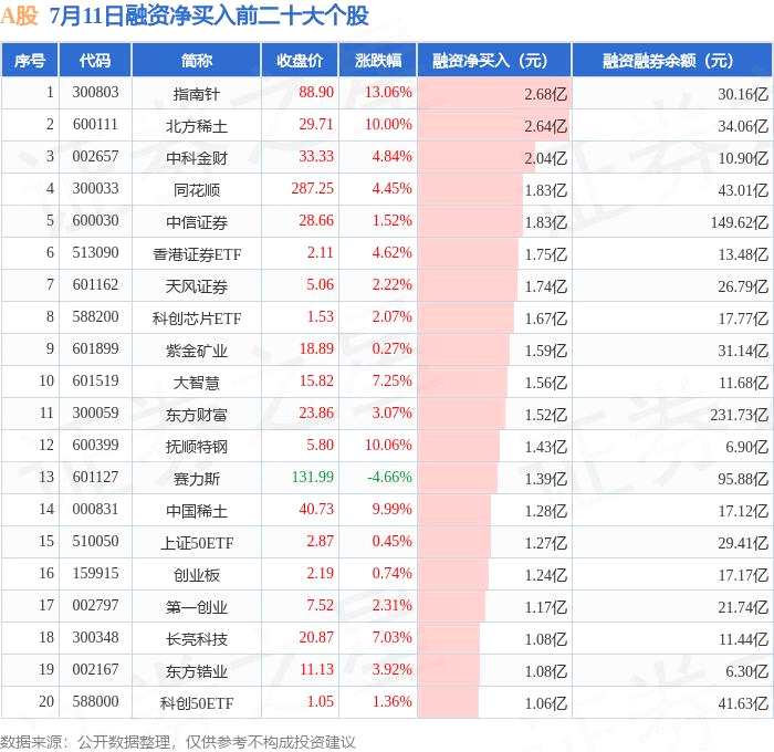 7月11日A股融資凈買(mǎi)入排行榜:指南針融資凈買(mǎi)入居首