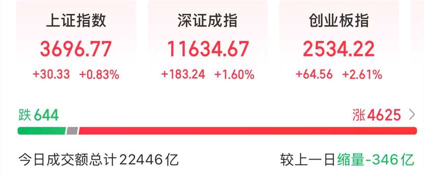 整體看,今天A股迎來普漲,逾4600只個(gè)股上漲。市場(chǎng)成交額為22446億元,連續(xù)第3天突破2萬億元。