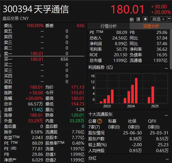 天孚通信2025年上半年實現(xiàn)營業(yè)收入24.56億元,同比增長57.84%;歸母凈利潤8.99億元,同比增長37.46%;基本每股收益1.1580元。公司擬每10股派發(fā)現(xiàn)金紅利5元(含稅)。