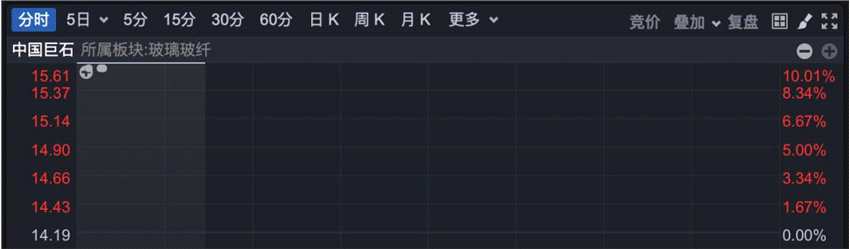 建筑材料概念走高,中國巨石(600176)漲停。中材科技(002080)、長海股份(300196)、山東玻纖(605006)、龍泉股份(002671)、再升科技(603601)跟漲。