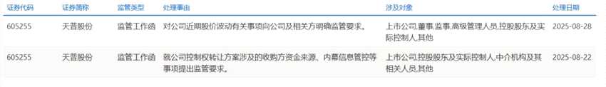 自8月22日開盤以來,天普股份連續(xù)漲停,交易所連發(fā)兩份監(jiān)管函。8月22日,天普股份復(fù)牌當(dāng)日,收到上交所下發(fā)的關(guān)于公司控制權(quán)變更有關(guān)事項的監(jiān)管工作函,監(jiān)管內(nèi)容聚焦于公司控制權(quán)轉(zhuǎn)讓方案涉及的收購方資金來源、內(nèi)幕信息管控等事項。8月28日,天普股份再次收到上交所下發(fā)的監(jiān)管工作函。