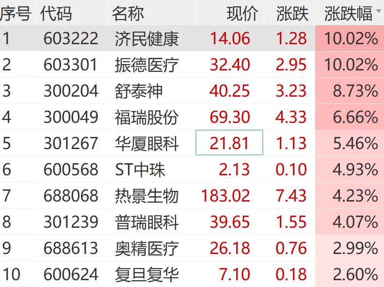 個(gè)股方面,濟(jì)民健康(603222)走出12天6板,振德醫(yī)療(603301)漲停,舒泰神(300204)、福瑞股份(300049)、華廈眼科(301267)等跟漲。