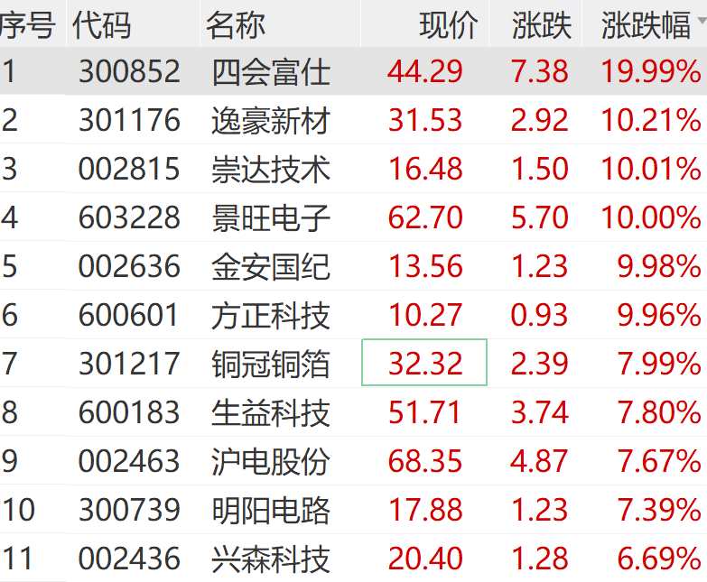 PCB概念股集體拉升,四會(huì)富仕走出20cm漲停,景旺電子(603228)、金安國紀(jì)(002636)等多股漲停。