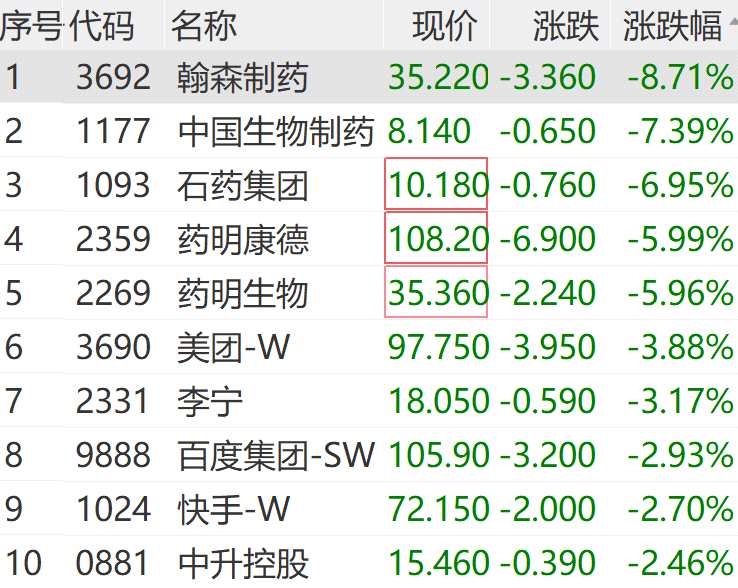 港股市場(chǎng)盤初走低,截至發(fā)稿,恒生科技指數(shù)、恒生國企指數(shù)跌超1%,恒生生物科技指數(shù)大跌4%。翰森制藥、中國生物制藥、石藥集團(tuán)等醫(yī)藥股領(lǐng)跌恒指成份股。