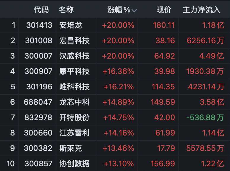 市場(chǎng)熱點(diǎn)方面,機(jī)器人產(chǎn)業(yè)鏈全線(xiàn)走強(qiáng),板塊指數(shù)高開(kāi)高走,以最高點(diǎn)報(bào)收。板塊內(nèi)個(gè)股掀漲停潮,安培龍(301413)、宏昌科技(301008)、漢威科技(300007)等多股20%漲停,萬(wàn)向錢(qián)潮(000559)、三花智控(002050)、雙環(huán)傳動(dòng)(002472)等超40股漲?;驖q超10%。
