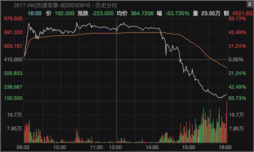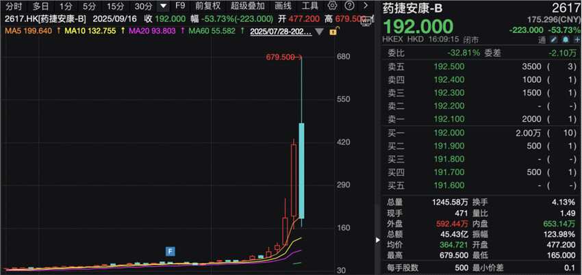 港股市場(chǎng)近期大牛股藥捷安康出現(xiàn)大反轉(zhuǎn),早盤(pán)時(shí)還一度大漲逾63%,最高觸及679.5港元/股,短短7個(gè)交易日上漲超10倍;以上市首日開(kāi)盤(pán)價(jià)20港元計(jì)算,不到3個(gè)月時(shí)間飆漲超30倍,總市值一度達(dá)到逾2697億港元。午后,藥捷安康畫(huà)風(fēng)突變,快速跳水。截至收盤(pán),跌逾53%,報(bào)192港元/股。