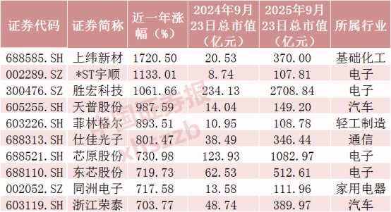剔除近一年上市的新股,近一年累計漲幅前十的股票分別為上緯新材、*ST宇順(002289)、勝宏科技(300476)、天普股份(605255)、菲林格爾(603226)、仕佳光子、芯原股份、東芯股份、同洲電子(002052)、浙江榮泰(603119),漲幅均超700%,其中上緯新材、*ST宇順、勝宏科技漲幅均超1000%。
