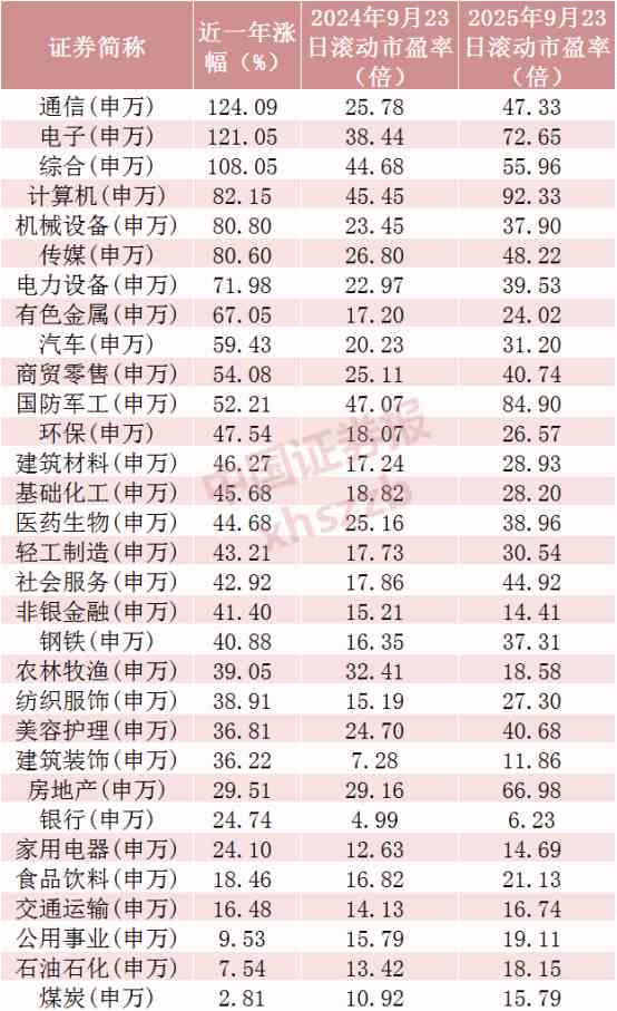 近一年,申萬一級31個行業(yè)全線上漲,科技股領(lǐng)漲市場,引領(lǐng)A股估值提升。通信、電子、綜合行業(yè)漲幅居前,分別上漲124.09%、121.05%、108.05%,計算機、機械設(shè)備、傳媒行業(yè)均累計漲逾80%,僅煤炭、石油石化、公用事業(yè)行業(yè)累計漲幅不足10%。