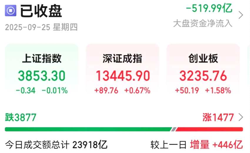 截至收盤,上證指數(shù)微跌0.01%,深證成指漲0.67%,創(chuàng)業(yè)板指漲1.58%。全市場成交額2.39萬億元,較上一個交易日放量446億元。