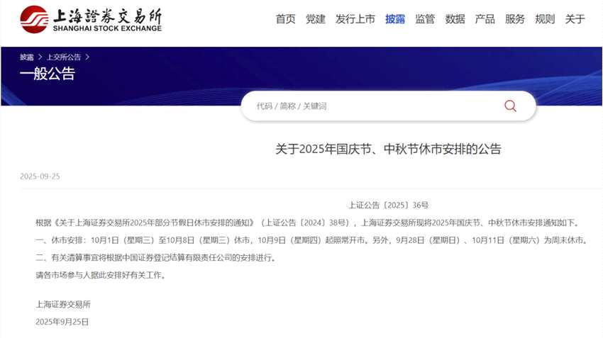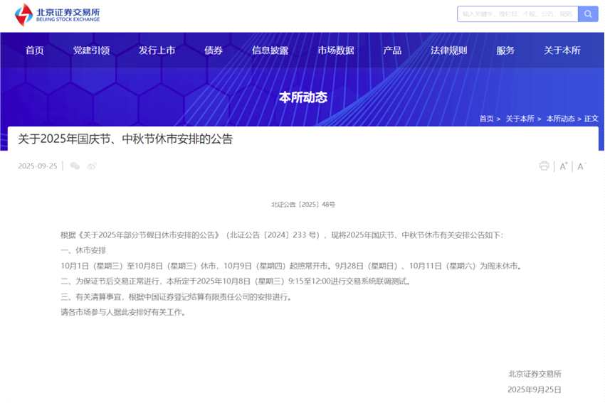 9月25日,滬深北交易所分別發(fā)布關(guān)于2025年國(guó)慶節(jié)、中秋節(jié)休市安排的公告。