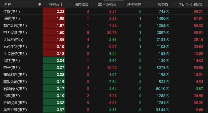 板塊分化,傳媒、通信、有色金屬、電力設(shè)備、計(jì)算機(jī)等板塊漲幅靠前。