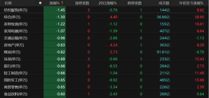 大消費(fèi)領(lǐng)域仍弱勢(shì),紡織服飾、家用電器等板塊領(lǐng)跌。
