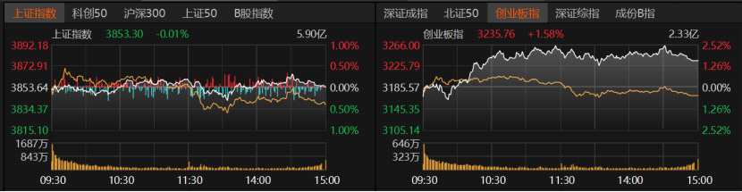 截至今日收盤(pán),滬指微跌0.01%報(bào)3853.3點(diǎn),創(chuàng)業(yè)板收漲1.58%報(bào)3235.76點(diǎn),深證成指收漲0.67%。滬深300、上證50微漲,科創(chuàng)50漲逾1%,北證50跌逾1%。