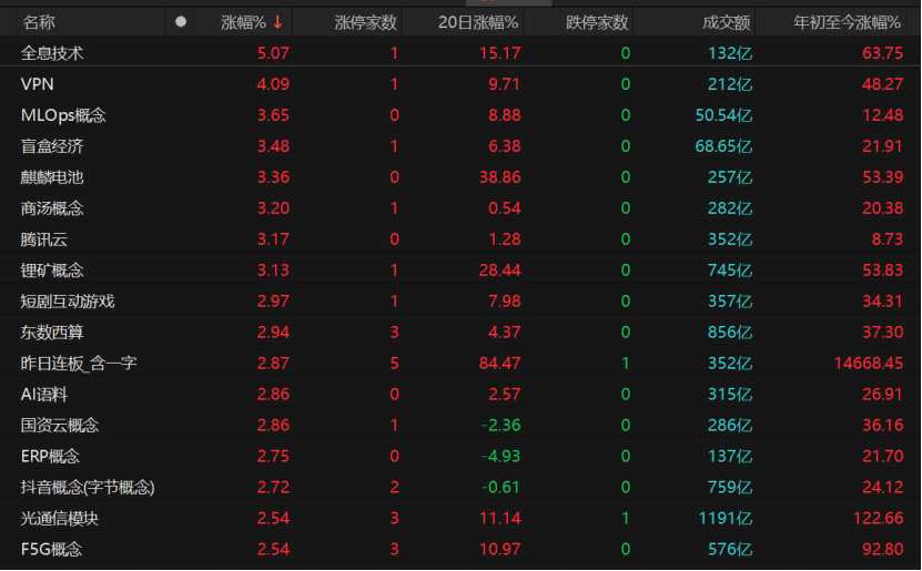 鋰礦概念、麒麟電池、AI語(yǔ)料、光通信模塊均表現(xiàn)不錯(cuò)。