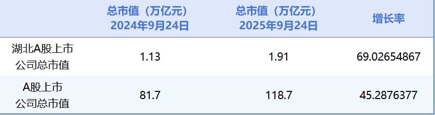 湖北日報訊(記者王艷華)截至9月24日,自2024年“924”一攬子金融政策推出1年以來,湖北A股上市公司實現(xiàn)總市值從約1.13萬億元增長到約1.9萬億元,漲超7000億元,增長率超60%。市值超百億的企業(yè)更多,市值排名前列的企業(yè)“含科量”更高。