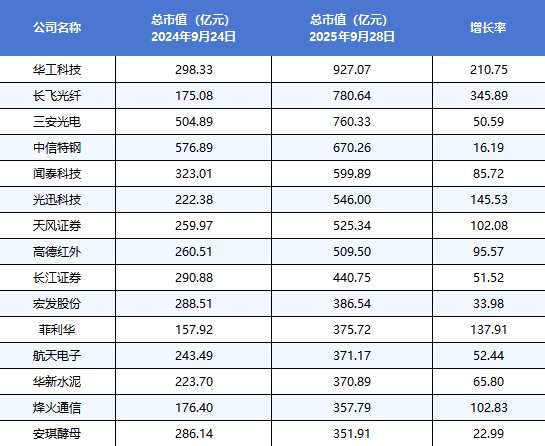 與總市值持續(xù)上漲、“含科量”更高的A股市場同頻,從去年9月24日到今年9月28日,湖北A股上市公司總市值從約1.13萬億元增長到約1.88萬億元,增長率達65.64%。總市值超百億元的企業(yè)數(shù)量,從33家增加到48家。市值增長最快的是長飛光纖(601869),增長率為345.89%。
