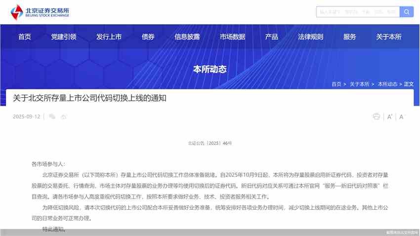 在實(shí)施了多次全網(wǎng)測(cè)試后,北交所宣布10月9日起將為存量股票啟用新證券代碼。